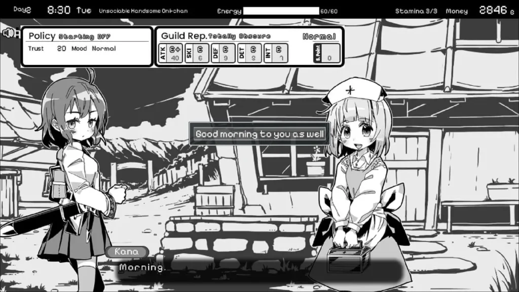 * Guild Quests & Training: This is your primary grind. Completing adventurers guild quests gives you cash and sometimes items, and is the only way to increase your Renown rank for better jobs. Training at the guild costs energy but increases your STR, AGI, or VIT stats directly. A good early game tip for Monochrome Fantasy is to do one or two simple quests and spend one block training a key stat each day early on.